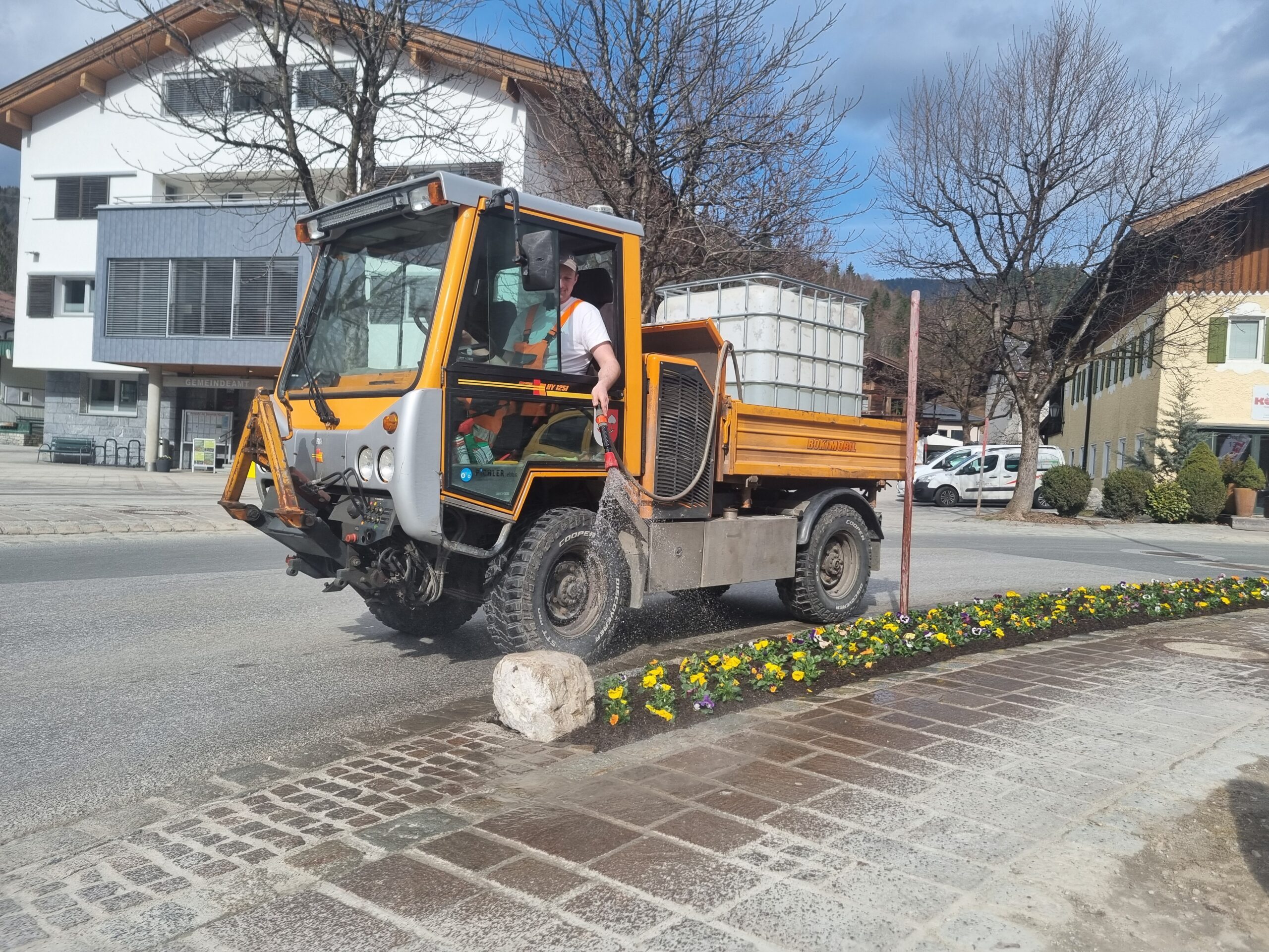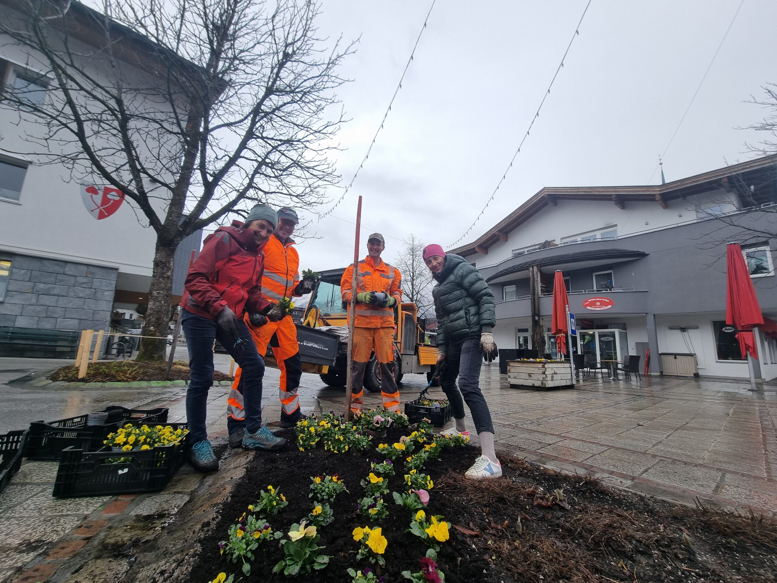 > Finaler Schliff: Im Zuge der Frühjahrsbepflanzung durch„Schönes für Dahoam“ platzierten die Mitarbeiter des Bauhofs der Gemeinde Kössen die bunten Botschafter an den Kreisverkehren und am Dorfplatz.