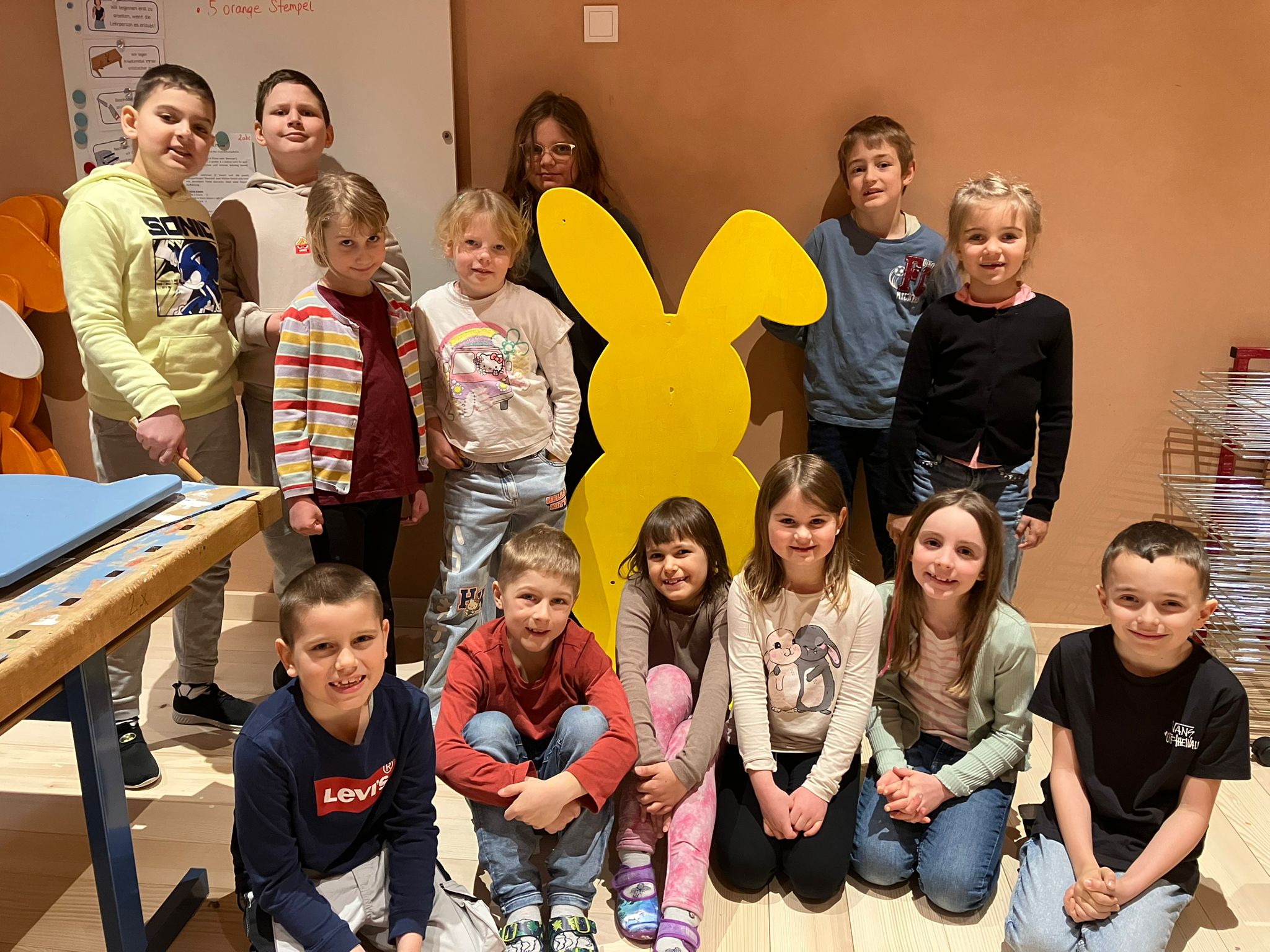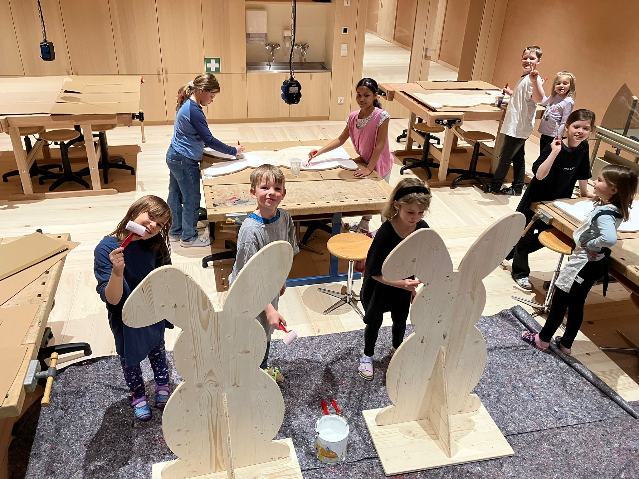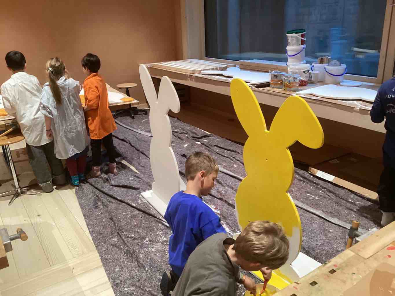 > Kreativität der Schulkinder: Die Kinder der zweiten Volksschulklassen des Bildungszentrums Kössen griffen gemeinsam mit ihren Lehrerinnen rund um Sylvia Hausberger zu den Pinseln. In den fröhlichen Corporate-Design-Farben der Gemeinde Kössen – Klobensteingelb, Kohlenbachblau und Glutorange – erhielten die Hasen ihr leuchtendes Gewand.