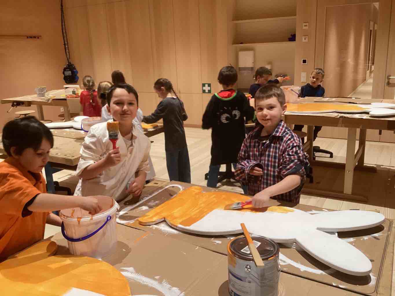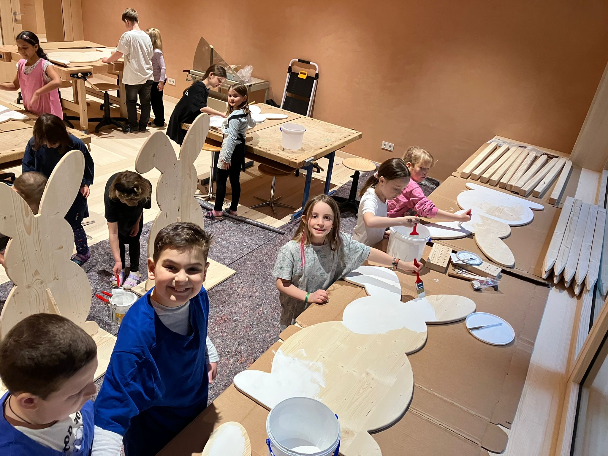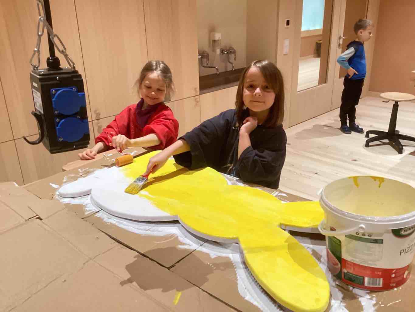 > Kreativität der Schulkinder: Die Kinder der zweiten Volksschulklassen des Bildungszentrums Kössen griffen gemeinsam mit ihren Lehrerinnen rund um Sylvia Hausberger zu den Pinseln. In den fröhlichen Corporate-Design-Farben der Gemeinde Kössen – Klobensteingelb, Kohlenbachblau und Glutorange – erhielten die Hasen ihr leuchtendes Gewand.